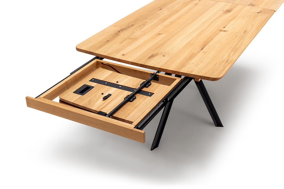 Für maximale Flexibilität lässt sich WIEN im Handumdrehen vergrößern – wahlweise über den komfortablen Kopfauszug oder den 80-cm-Synchronauszug für Tischlängen von 160 bis 240 cm. Beide Varianten sind einfach und schnell zu bedienen und erweitern die Tischfläche mühelos, wann immer mehr Platz benötigt wird.