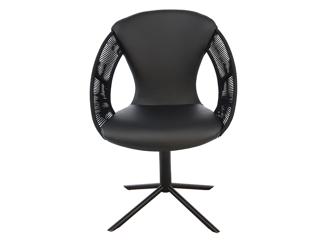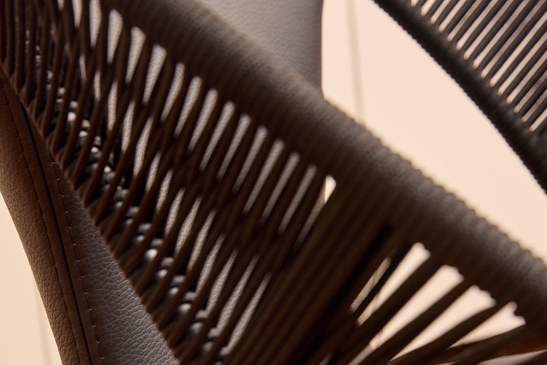 Die Sitzschale wird durch ein feines Schnurelement unterbrochen, das dem Sessel Transparenz und eine besondere Leichtigkeit verleiht.
